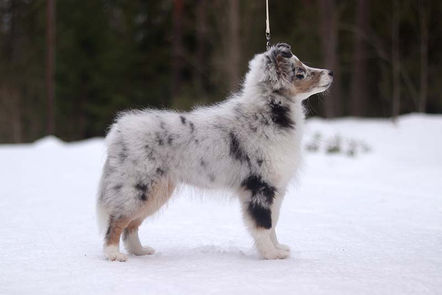 Lumolla on kaunis narttumainen ilme, hyvä rintakehä ja lupaava tasapainoinen rakenne. Merle väri on kaunis ja kirkas,